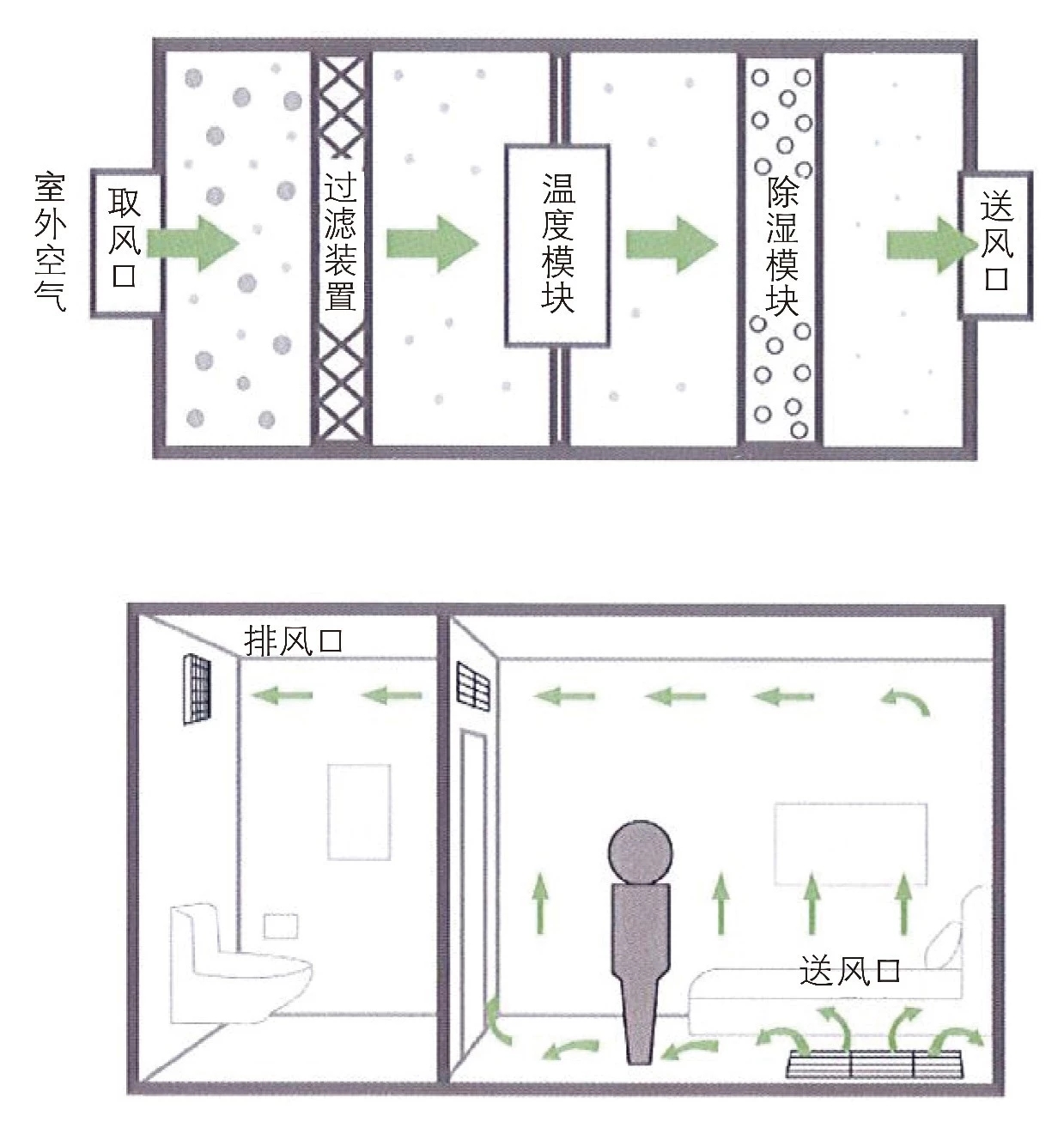 地出新风经过预冷或预热、除尘除湿送入室内。因为风速低,温度低,慢慢在地面堆积;将室内的污染空气挤压上升,从顶部的排风口排出室外。
